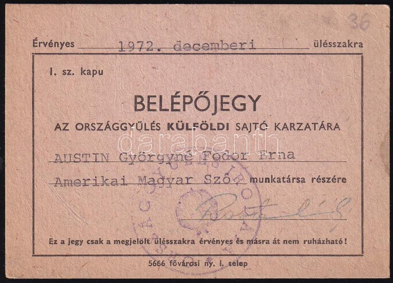 1972 Belépőjegy az Országgyűlés külföldi sajtó karzatára az Amerikai M... https://www.darabanth.com/de/442-Fernauktion/442.0/Kunst-Dokumente-andere-Sammelgebiete/Dokument~500021/1972-Belepojegy-az-Orszaggyules-kulfoldi-sajto-karzatara-az-Amerikai-Magyar-Szo-munkatars~II2913395