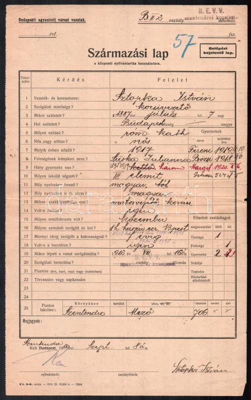 cca 1880-1950 vegyes papírrégiség tétel, össz. 4 db: 1920 származási lap kocsivezető részére, Budapesti egyesített városi vasutak, BEVV szentendrei kocsiszín bélyegzővel + 1882 kisorsolási kötvény 5 forint stb.