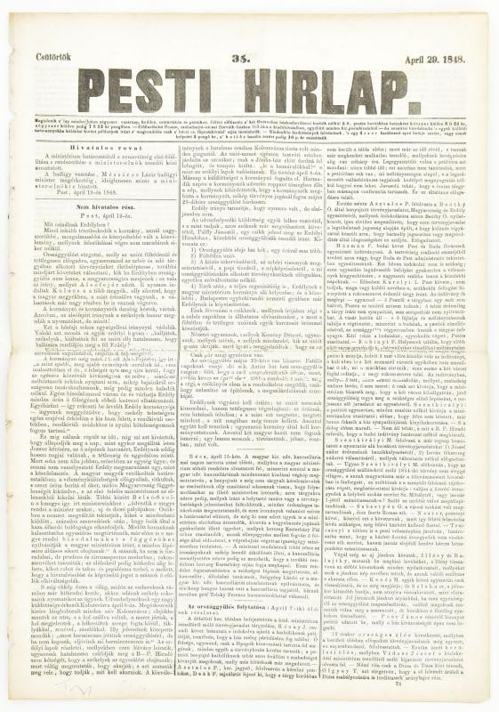 1848 A Pesti Hírlap április 29-i száma https://www.darabanth.com/de/442-Fernauktion/442.0/Kunst-Dokumente-andere-Sammelgebiete/Drucksachen~1000005/1848-A-Pesti-Hirlap-aprilis-29-i-szama~II2908684