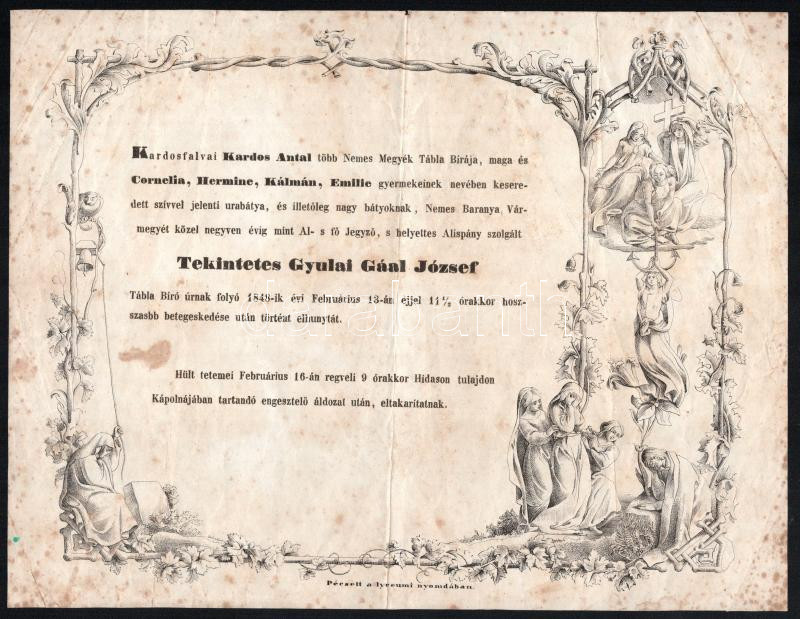 1848 Gyulai Gaál József táblabíró, korábbi Baranya megyei főjegyző és alispán gyászjelentése, hajtásnyomokkal, foltos, Pécs, lyceumi nyomda, 22x28,5 cm