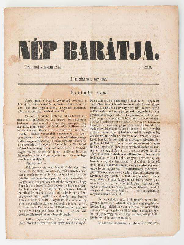 1849 A Nép Barátja című újság 17. száma (május 13.) https://www.darabanth.com/de/442-Fernauktion/442.0/Kunst-Dokumente-andere-Sammelgebiete/Drucksachen~1000005/1849-A-Nep-Baratja-cimu-ujsag-17-szama-majus-13~II2910913