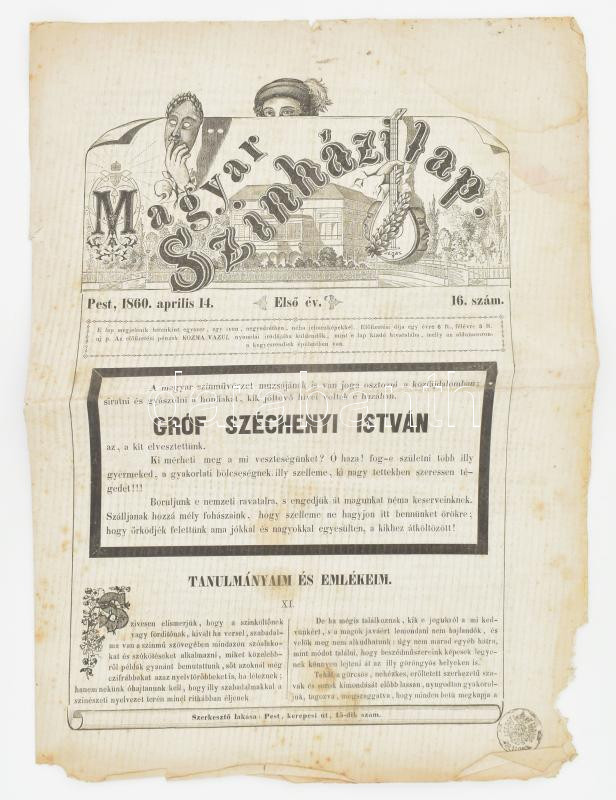 Beschreibung: 1860 Pest, A Magyar Színházi Lap I. évfolyam 16. szám, címlapon Széchenyi István halálhírével, hiányos