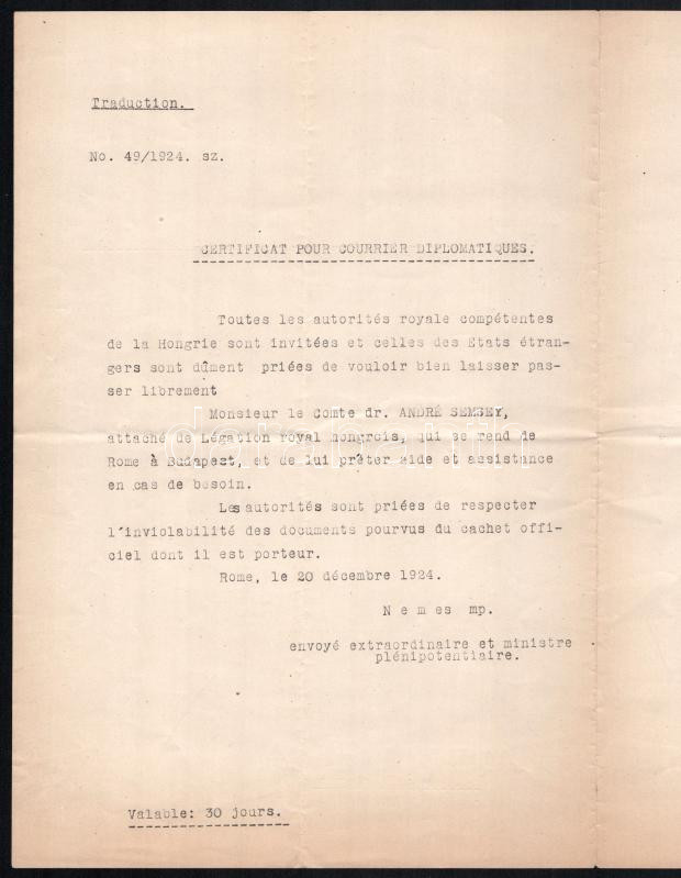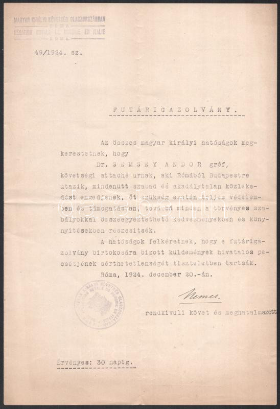 1924 Róma, gróf Semsey Andor (1897-1977) diplomata, későbbi egyiptomi és argentínai követ részére szóló futárigazolvány, magyar és francia nyelven, rajta gróf hídvégi gróf Nemes Albert (1866-1940) diplomata,műgyűjtő, római rendkívüli követ és meghatalmazott aláírásával, "Magyar Királyi Követség Olaszországban Róma" bélyegzéssel.