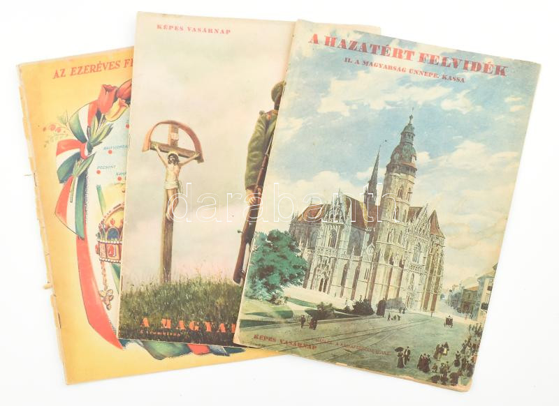 1938 Képes Vasárnap 3 db száma, ebből 2 db a vissza tért Felvidékről. Tűzött papírkötés, "Az ezeréves Felvidék" c. lapszám utolsó néhány oldala és hátsó borítója hiányzik.