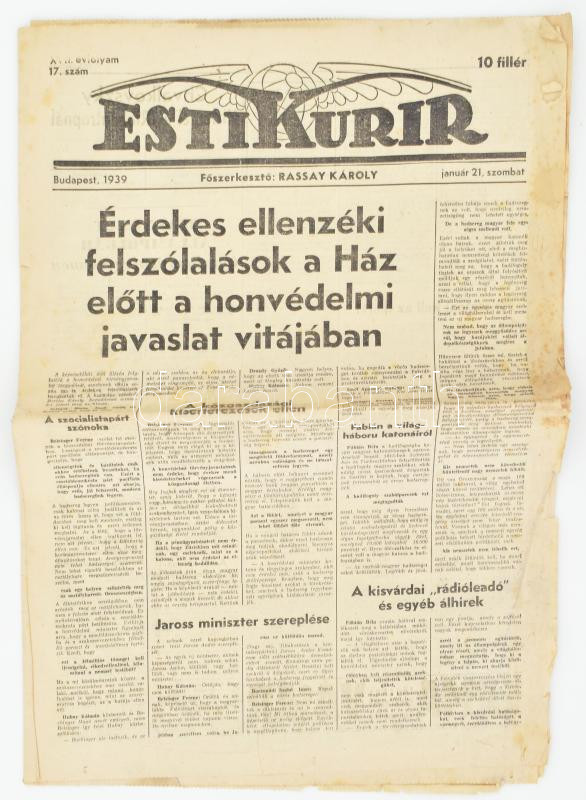 1939 Esti Kurir XVII. évf. 17. sz., 1939. jan. 21., a címlapon: "Érdekes ellenzéki felszólalások a Ház előtt a honvédelmi javaslat vitájában", kisebb szakadásokkal, foltokkal, 12 p.