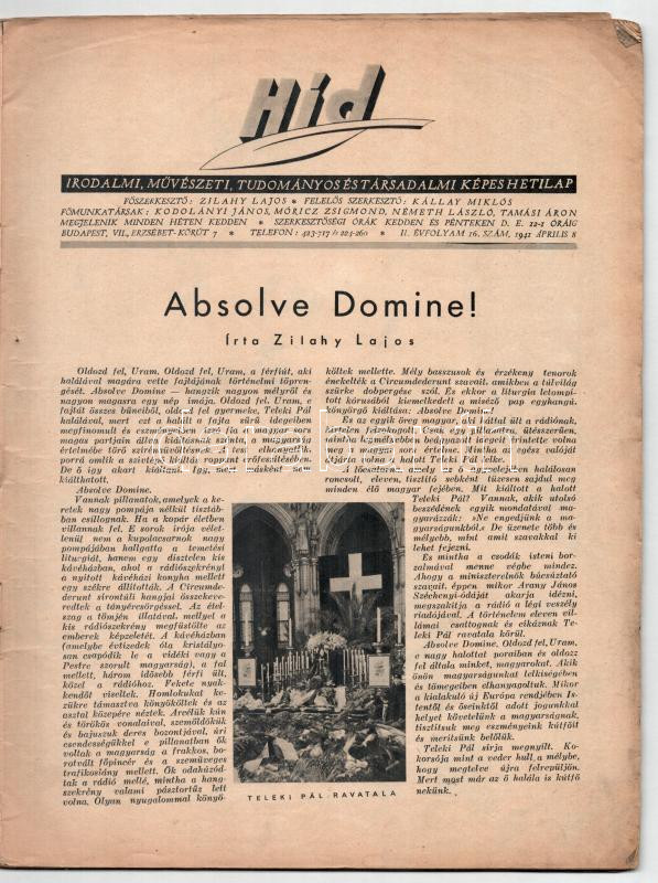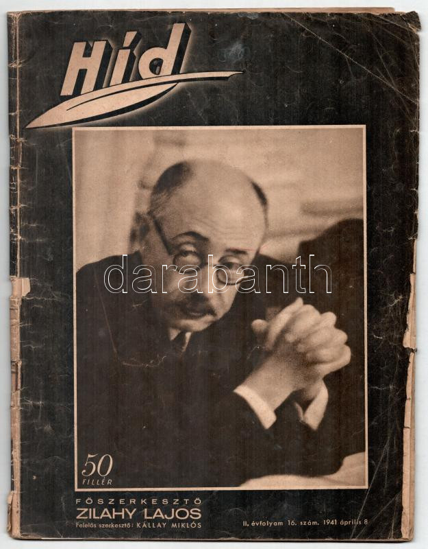 1941 A Híd című újság 16. száma Teleki Pál haláláról, színes képmellék... https://www.darabanth.com/de/442-Fernauktion/442.0/Kunst-Dokumente-andere-Sammelgebiete/Drucksachen~1000005/1941-A-Hid-cimu-ujsag-16-szama-Teleki-Pal-halalarol-szines-kepmelleklettel~II2910964