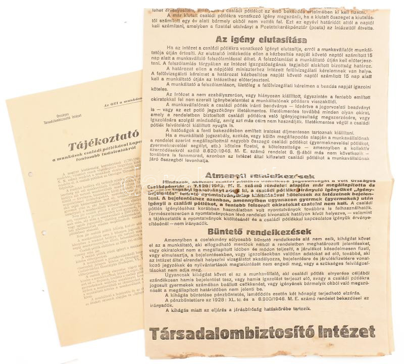 Beschreibung: 1946 OTI hirdetmény a munkások családi pótlékáról, sérült, lyukasztott, 82x57 cm és tájékoztató a munkások családi pótlékával kapcsolatban, lyukasztott