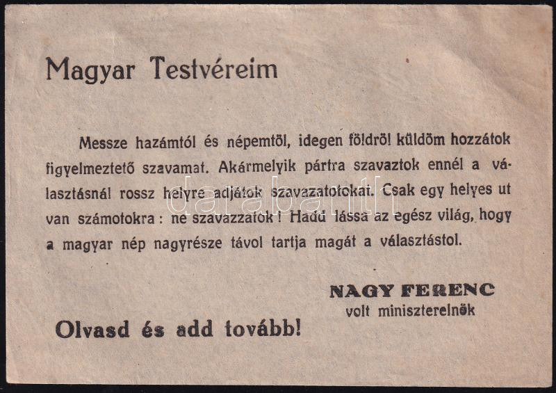 Beschreibung: 1947 "Magyar Testvéreim" Nagy Ferenc volt miniszterelnök felhívása, kérve a '47-es választásról történő távolmaradást, jó állapotban