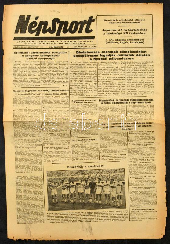 1952 Népsport VIII. évf. 161. sz., 1952. aug. 7., a Helsinki olimpia híreivel (a magyar olimpikonok ünnepélyes fogadása; alul az Aranycsapat fotója), kis lapszéli sérülésekkel, 4 p.