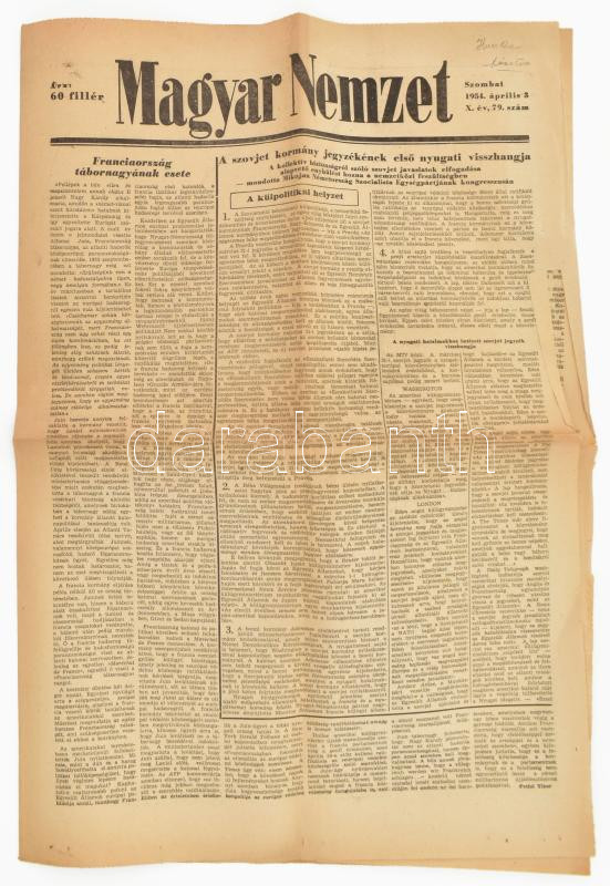 1954 A Magyar Nemzet X. évfolyamának 79. száma https://www.darabanth.com/de/442-Fernauktion/442.0/Kunst-Dokumente-andere-Sammelgebiete/Drucksachen~1000005/1954-A-Magyar-Nemzet-X-evfolyamanak-79-szama~II2911027