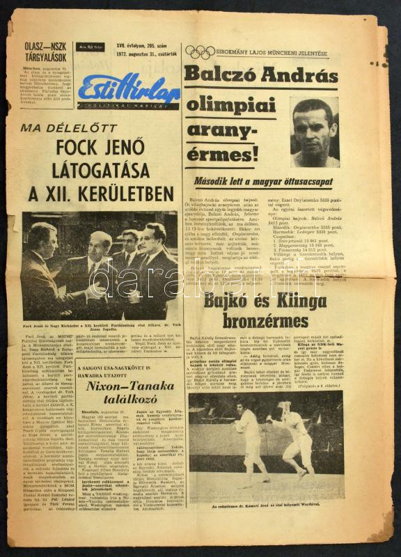 1972 Esti Hírlap XVII. évf. 205. sz., 1972. aug. 31., a címlapon: &quo... https://www.darabanth.com/de/442-Fernauktion/442.0/Kunst-Dokumente-andere-Sammelgebiete/Drucksachen~1000005/1972-Esti-Hirlap-XVII-evf-205-sz-1972-aug-31-a-cimlapon-Balczo-Andras-olimpiai-arany~II2878559