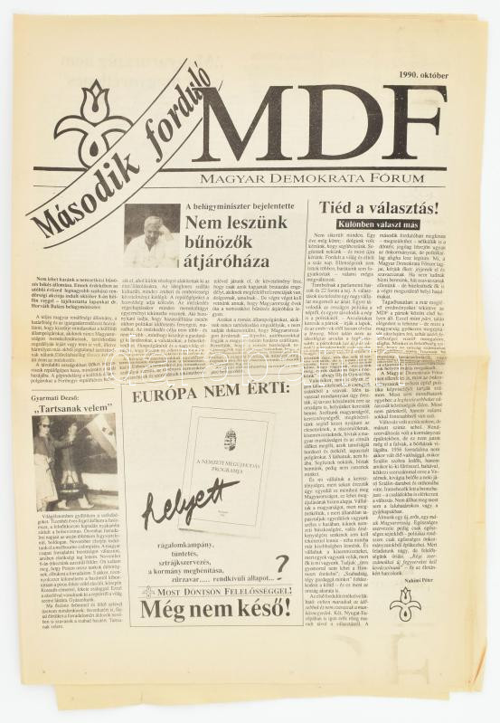 1990. október, MDF - Magyar Demokrata Fórum második forduló https://www.darabanth.com/de/442-Fernauktion/442.0/Kunst-Dokumente-andere-Sammelgebiete/Drucksachen~1000005/1990-oktober-MDF-Magyar-Demokrata-Forum-masodik-fordulo~II2911143