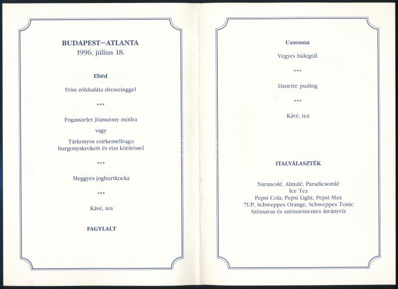 1996 A Malév olimpiai különjáratának (Bp.-Atlanta) fedélzeti menüje és... https://www.darabanth.com/de/442-Fernauktion/442.0/Kunst-Dokumente-andere-Sammelgebiete/Drucksachen~1000005/1996-A-Malev-olimpiai-kulonjaratanak-Bp-Atlanta-fedelzeti-menuje-es-programfuzete~II2879920