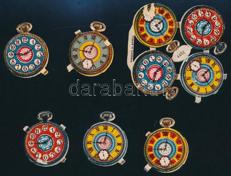 Beschreibung: 9 db óra számlapot ábrázoló nyomat, egy sérült d: 35 mm