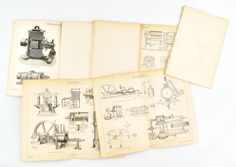 Beschreibung: cca 1900 Gőzgépek, dinamók, 10 db melléklet a Pallas Nagy Lexikonából, vegyes állapotban, 30x23 cm körül
