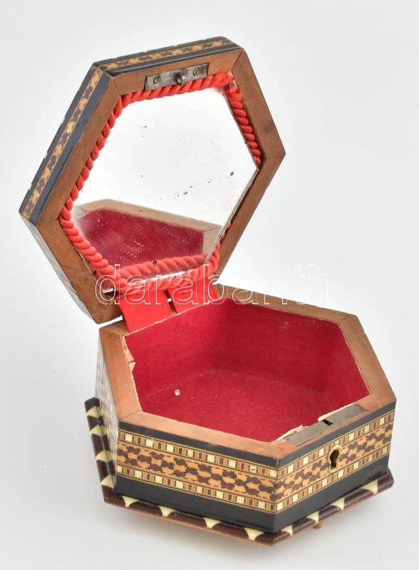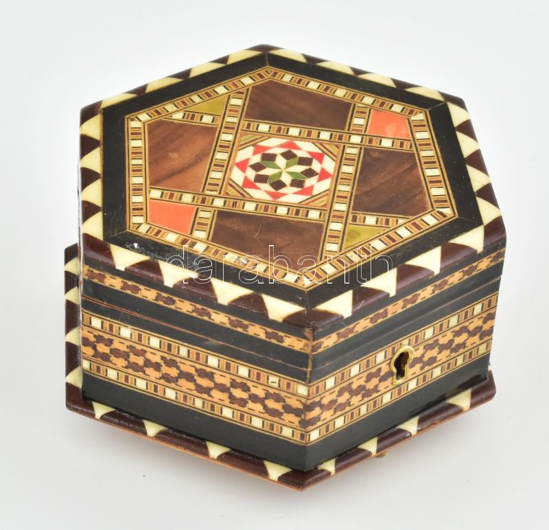 Keleti mintás ékszeres fa dobozka, kulcs nélkül. Tükörrel d: 14 cm https://www.darabanth.com/de/442-Fernauktion/442.0/Kunst-Dokumente-andere-Sammelgebiete/Flohmarkt~500015/Keleti-mintas-ekszeres-fa-dobozka-kulcs-nelkul-Tukorrel-d-14-cm~II2875837