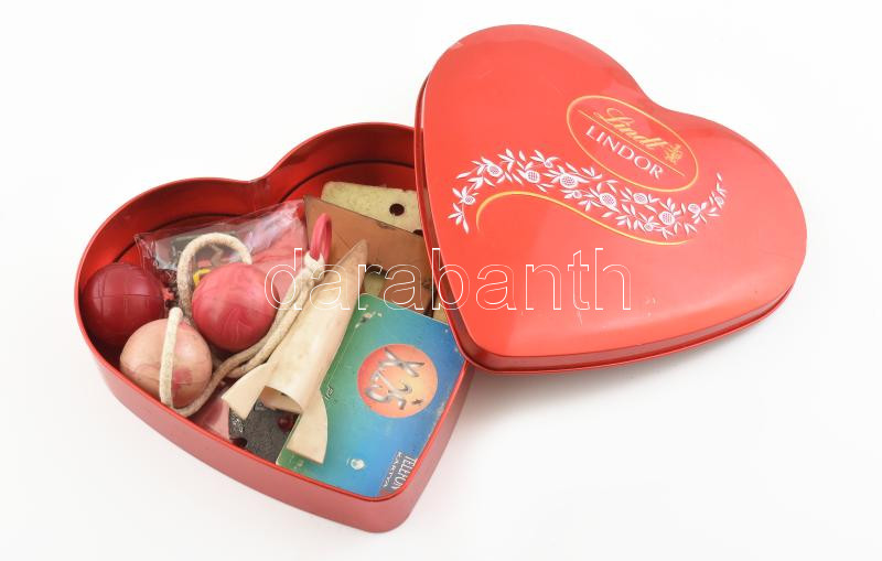 Beschreibung: Kis bolha tétel, szív alakú fémdobozban: TOTO reklámgolyó, szovjet rakéta formájú hőmérő, ólomkatona, stb. Vegyes állapotban.