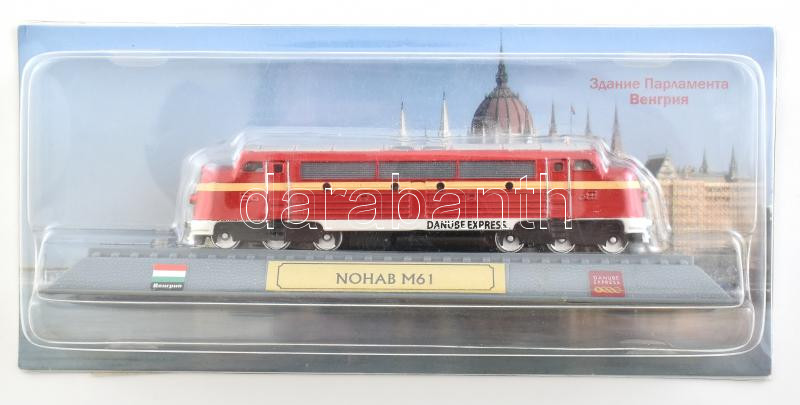 NOHAB modell, fém makett, original csomagolásban. Az MÁV M61-sorozat a MÁV részére szállított fővonali dízel-villamos erőátvitelű, Co'Co' tengelyelrendezésű dízelmozdony-sorozat. Beceneve ,,Nohab", a svéd gyártó, a NOHAB nevéből, ahol a széria gyártáskori típusjele Di.3a volt.