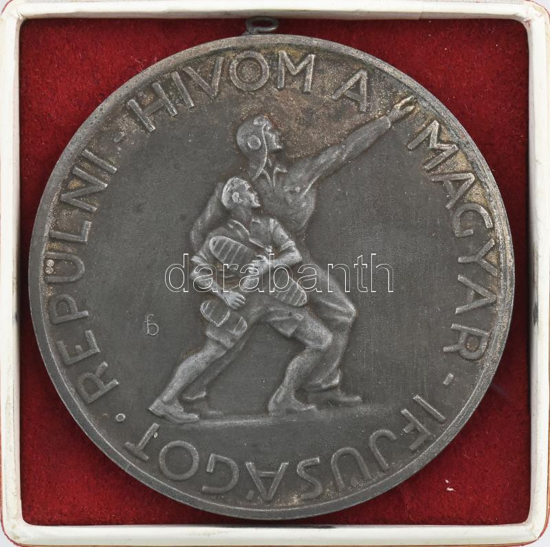 Repülőmodellezés - Pankotai Farkas Béla (1885-1945) ~1940. ,,Repülni Hívom a Magyar Ifjúságot" egyoldalas, öntött fém plakett (203,42g/99mm) / Hungary ~1940. "Repülni Hívom a Magyar Ifjúságot" one-sided cast metal plaque. Sign.: Béla Pankotai Farkas (203,42g/99mm), bordó dobozban. Prov.: Horváth Ernő (1916-2015) világ- Európa- és magyar bajnok repülő és -autómodellező, távolsági világcsúcstartó, a MÁV repülőmodellező klub vezetője hagyatékából.