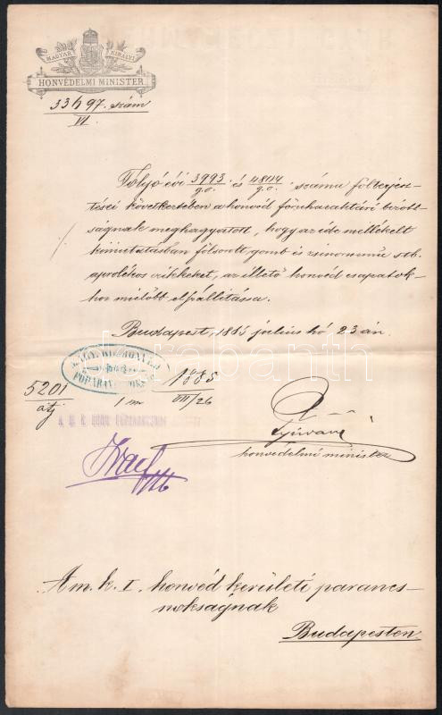 1885 Bp., M. kir. honvédelmi miniszter által kiállított hivatalos irat, báró Fejérváry Géza (1833-1914) honvédelmi miniszter (1905 és 1906 között miniszterelnök) aláírásával, bélyegzőkkel, fejléces papíron
