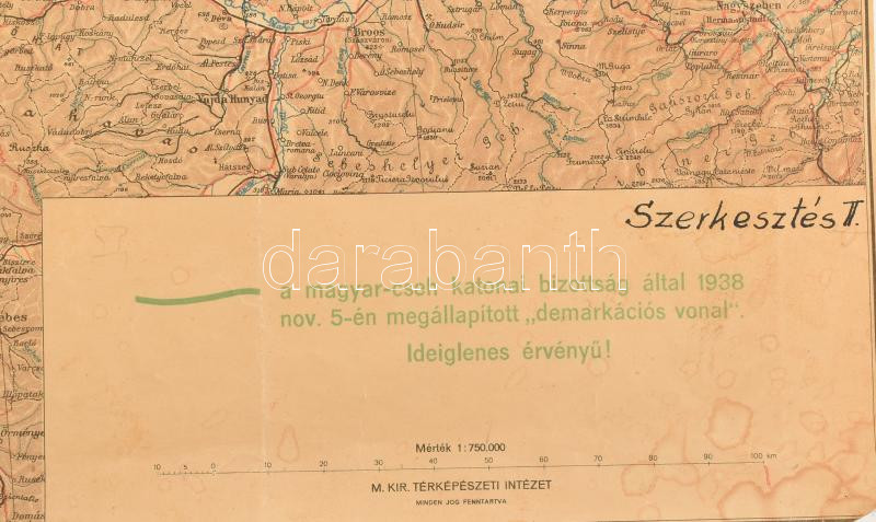 1938 Magyarország térkép a visszatért felvidéki területekkel (magyar cseh katonai bizottság által 1938 nov. 5-én megállapított "demarkációs vonal"), M. Kir. Térk. Intézet, 1: 750000, 70x100 cm, megviselt