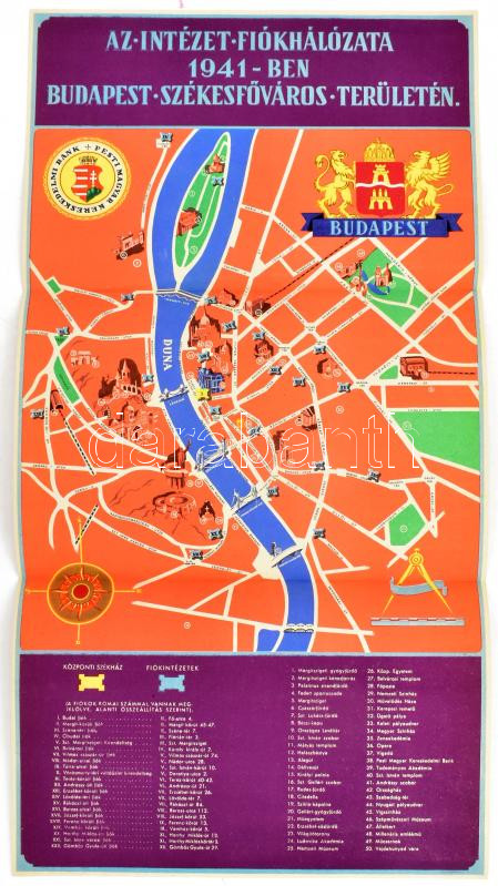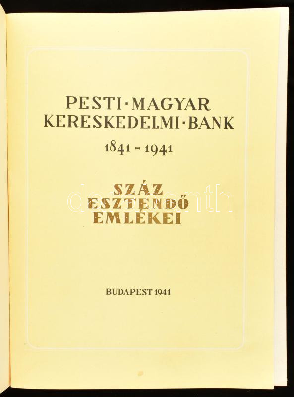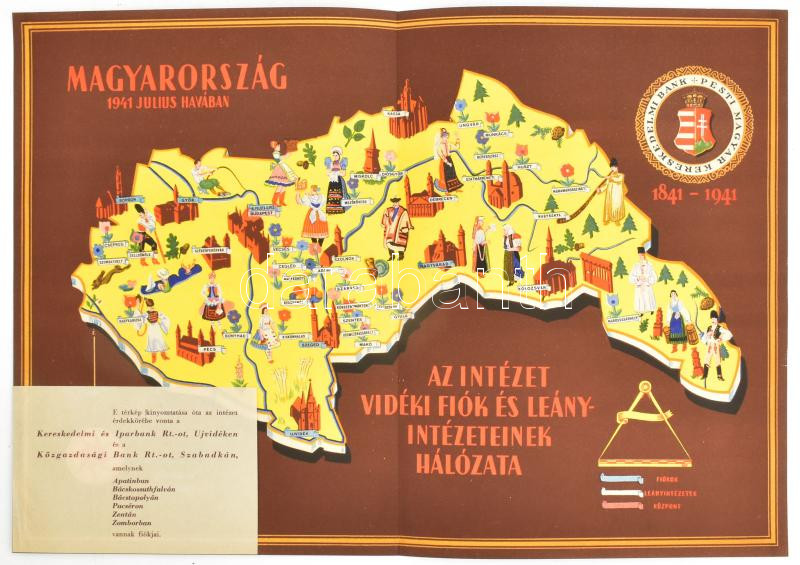 2 térkép-melléklet könyvben, a visszatért területekkel: Magyarország 1941 július havában-Az intézet vidéki fiók és leányintézeteinek hálózata, 29x41 cm, Az intézet fiókhálózata 1941-ben Budapest Székesfőváros területén, 56x29 cm. Pesti Magyar Kereskedelmi Bank 1841 - 1941. Száz esztendő emlékei. A bevezetőt dr. Lamotte Károly írta. Budapest, 1941,[Posner-ny.], 71 sztl. lev. + 2 (hasonmás)+2 (térkép) t. Gazdag képanyaggal illusztrált. Kiadói papírkötés, jó állapotban. Teljes, a térkép-mellékletek általában hiányoznak!