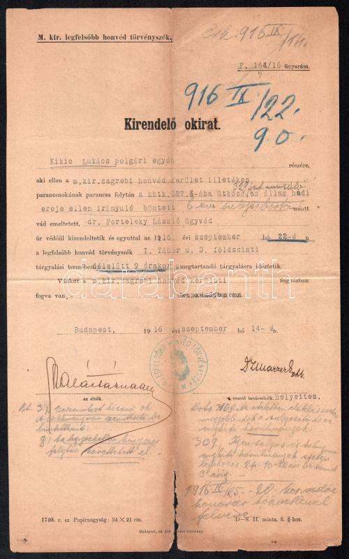 Beschreibung: 1916 Legfelsőbb Honvéd Törvényszék kirendelő okirat állam hadiereje ellni bűntettben