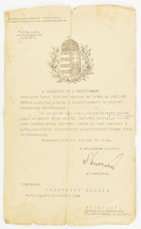 1927 Álgya-Pap (Papp) Sándor (1877-1961) altábornagy, honvédelmi álamtitkár saját kezű aláírásával ellátott okmány Jedovszky Henrik alezredes (a cs. és kir. Albrecht főherceg 44. gyalogezred korábbi századosa) nyugállományba helyezéséről, koronás-nemzeti kiscímeres fejléces papíron, sérült, kissé foltos