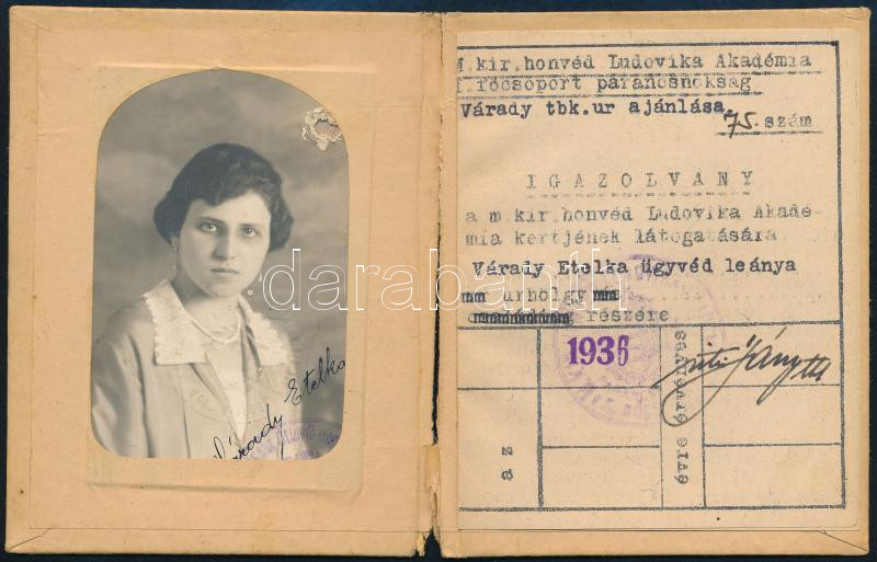 1938 Ludovika kerti belépő, sérült https://www.darabanth.com/de/442-Fernauktion/442.0/Kunst-Dokumente-andere-Sammelgebiete/Militaria~1000001/1938-Ludovika-kerti-belepo-serult~II2907667