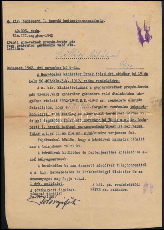 Beschreibung: 1942 Bp., a M. kir. budapesti I. honvéd hadtestparancsnokság felszólítása, tehergépkocsira vonatkozó kérdőív kitöltésére