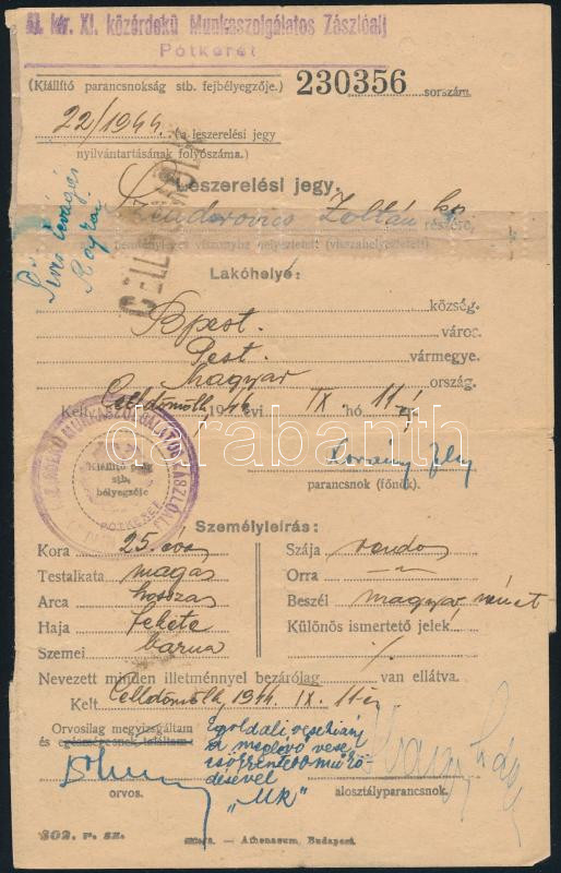 1944 Celldömölk, M. kir. XI. közérdekű Munkaszolgálatos Zászlóalj lesz... https://www.darabanth.com/de/442-Fernauktion/442.0/Kunst-Dokumente-andere-Sammelgebiete/Militaria~1000001/1944-Celldomolk-M-kir-XI-kozerdeku-Munkaszolgalatos-Zaszloalj-leszerelesi-jegy-a-hozzC3~II2908611