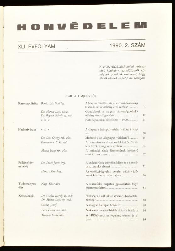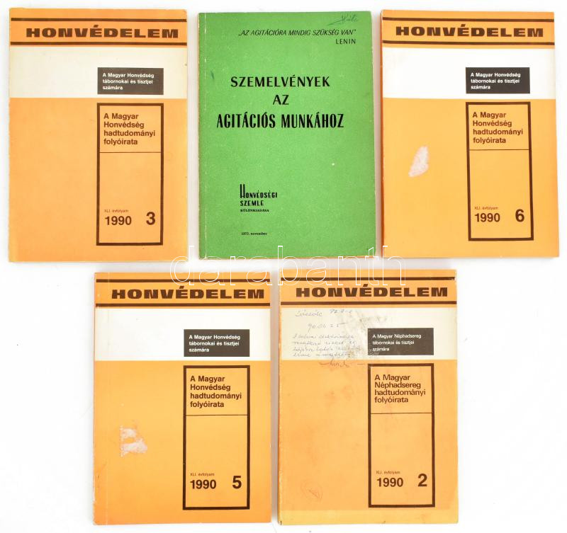 1973-1990 Honvédelem folyóirat 1990-es 4 száma, valamint az 1973. novemberi különkiadása, változó állapotban, két borítón címkenyomokkal, egy borító foltos és rajta bejegyzéssel.