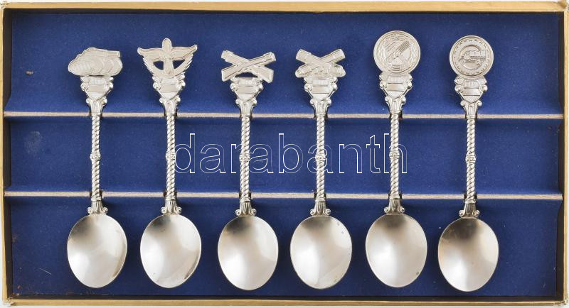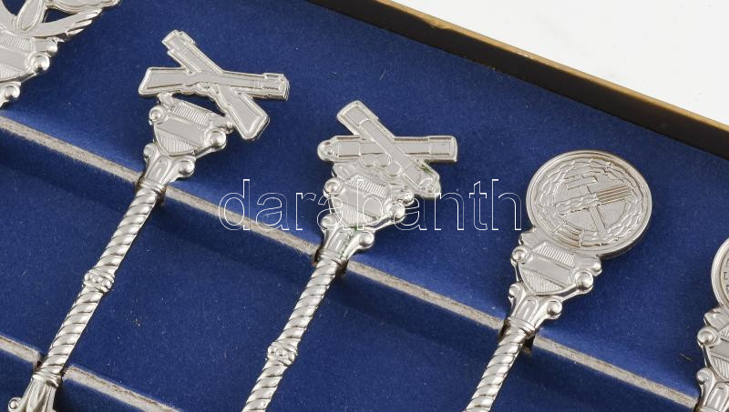 Beschreibung: Magyar Honvédség 6 darabos díszkanál szett dobozában, díszítésük jelzi a különböző egységek tevékenységét. Fém, jelzés nélkül, kis kopással, h: 11 cm