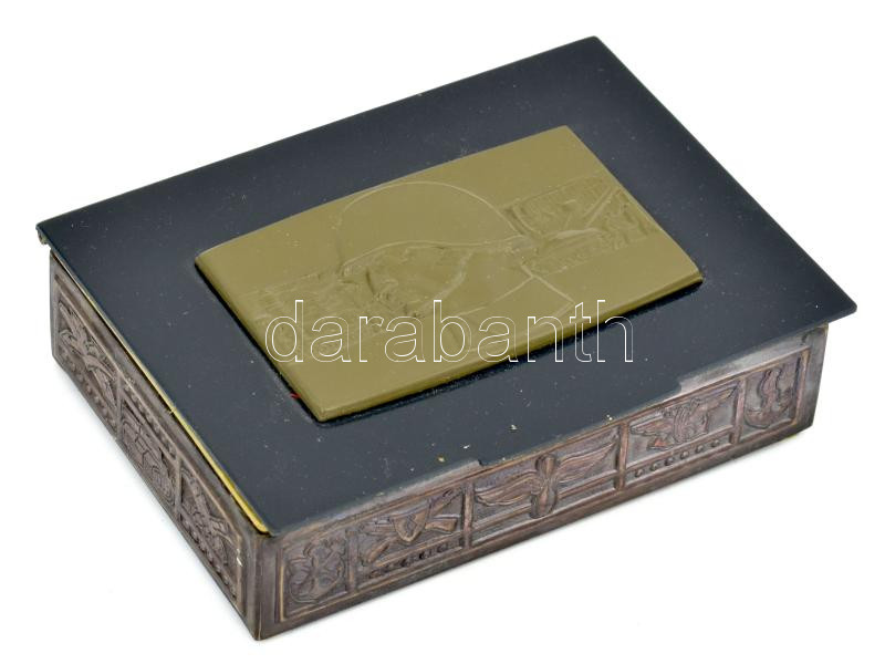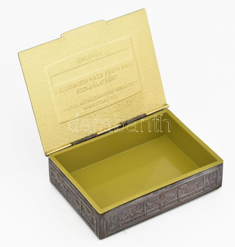 Magyar Néphadsereg katonai leszerelési emlékdoboz, belsejében felirattal: "Emlékül a szocialista haza fegyveres szolgálatáért, a Magyar Népköztársaság Honvédelmi Miniszterétől", jó állapotban, 12,5x9,5x3 cm. Állami Pénzverő kartondobozban.