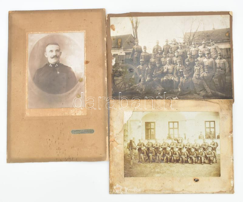 cca 1914-18 I. világháborús magyar katonaportré és csoportképek, részben kitüntetéssel dekorált, össz. 3 db keményhátú fotó, egyiken tüzérségi ágyúval és hátoldalán datált (1916.III.28), mind sérült, 16,5x22 és 27,5x18 cm közötti méretekben