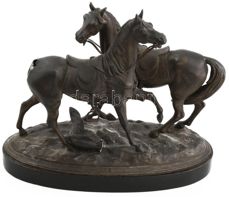 Beschreibung: Fém lópár szobor, fa talapzaton, sérült, m: 22,5 cm