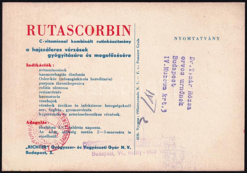 1951 A Richter gyógyszergyár Rutascorbin készítményének reklámnyomtatv... https://www.darabanth.com/de/442-Fernauktion/442.0/Kunst-Dokumente-andere-Sammelgebiete/Werbungen~500026/1951-A-Richter-gyogyszergyar-Rutascorbin-keszitmenyenek-reklamnyomtatvanya-haboru-elotti-~II2912924