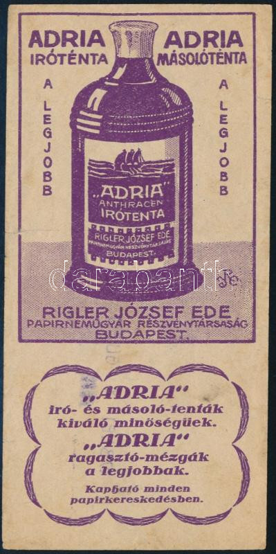 Adria írótenta Riegler József Ede számolócédula, szakadással https://www.darabanth.com/de/442-Fernauktion/442.0/Kunst-Dokumente-andere-Sammelgebiete/Werbungen~500026/Adria-irotenta-Riegler-Jozsef-Ede-szamolocedula-szakadassal~II2907355