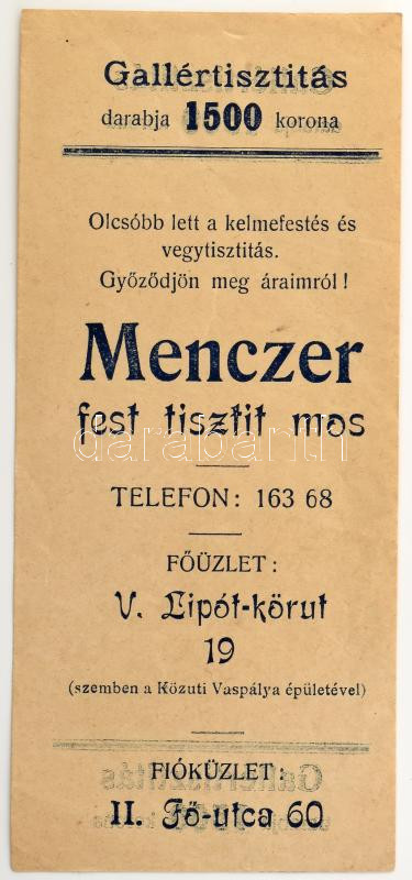 Menczer gallértisztítás számolócédula https://www.darabanth.com/de/442-Fernauktion/442.0/Kunst-Dokumente-andere-Sammelgebiete/Werbungen~500026/Menczer-gallertisztitas-szamolocedula~II2913814