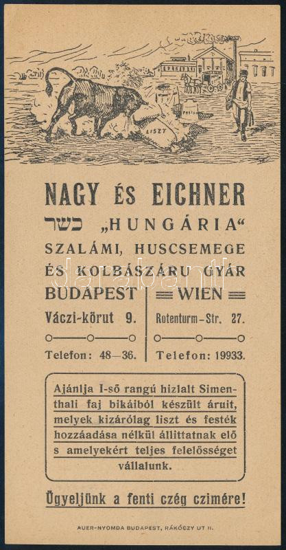 Nagy és Eichner Hungária szalámi számolócédula https://www.darabanth.com/de/442-Fernauktion/442.0/Kunst-Dokumente-andere-Sammelgebiete/Werbungen~500026/Nagy-es-Eichner-Hungaria-szalami-szamolocedula~II2907493
