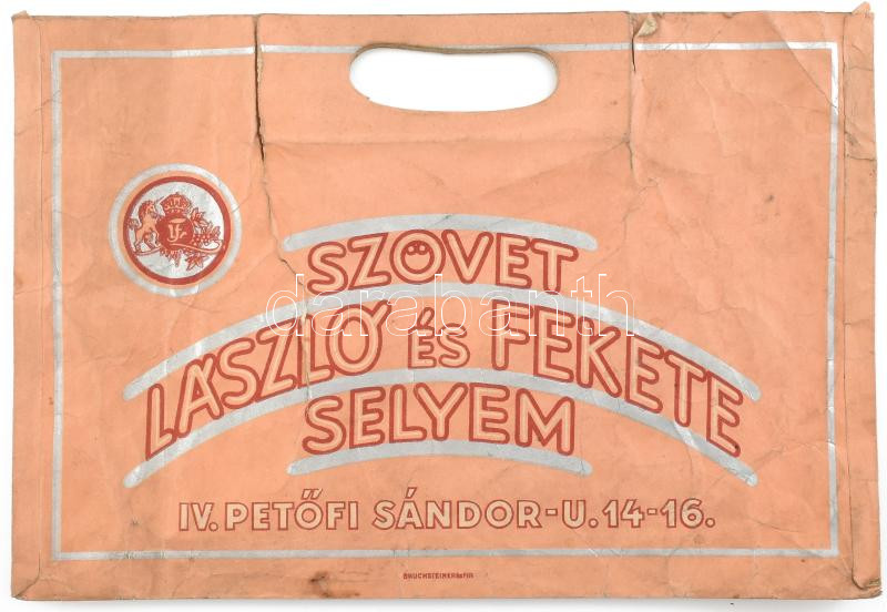 Beschreibung: cca 1930-40 László és Fekete, szövet és selyem, Bp. IV., Petőfi Sándor u. 14-16, papír reklám zacskó, sérült, 20,5x29,5 cm