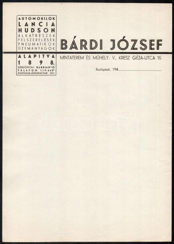 cca 1938 Bárdi József autókereskedő és szerviz cég dekoratív fejléces ... https://www.darabanth.com/de/442-Fernauktion/442.0/Kunst-Dokumente-andere-Sammelgebiete/Werbungen~500026/cca-1938-Bardi-Jozsef-autokereskedo-es-szerviz-ceg-dekorativ-fejleces-uzleti-levelpapirja~II2911695