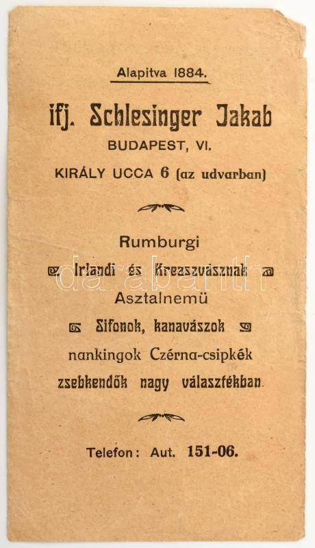 ifj. Schlesinger Jakab vászon kereskedés számolócédula, kis sérüléssel https://www.darabanth.com/de/442-Fernauktion/442.0/Kunst-Dokumente-andere-Sammelgebiete/Werbungen~500026/ifj-Schlesinger-Jakab-vaszon-kereskedes-szamolocedula-kis-serulessel~II2913606