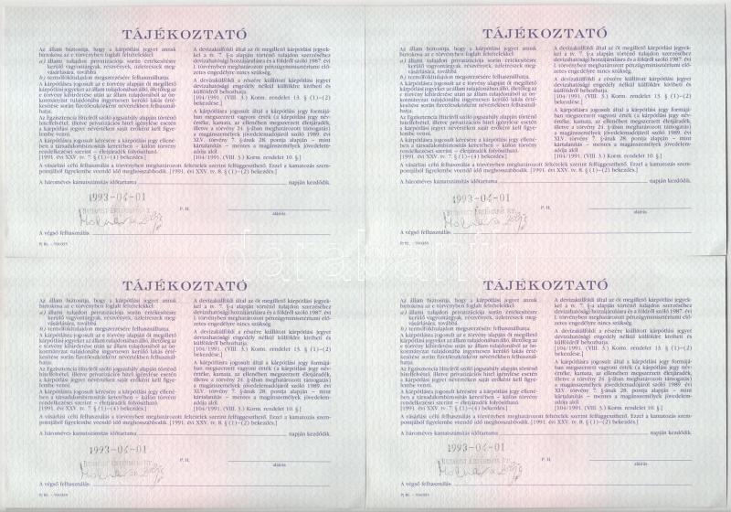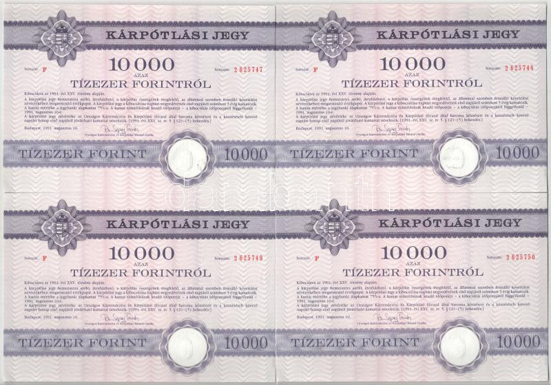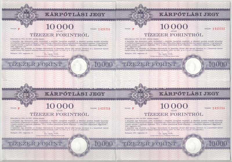 Beschreibung: Budapest 1991. "Országos Kárrendezési és Kárpótlási Hivatal" kárpótlási jegye 10.000Ft-ról (8x) "F 2625747 - F 2625754" T:AU