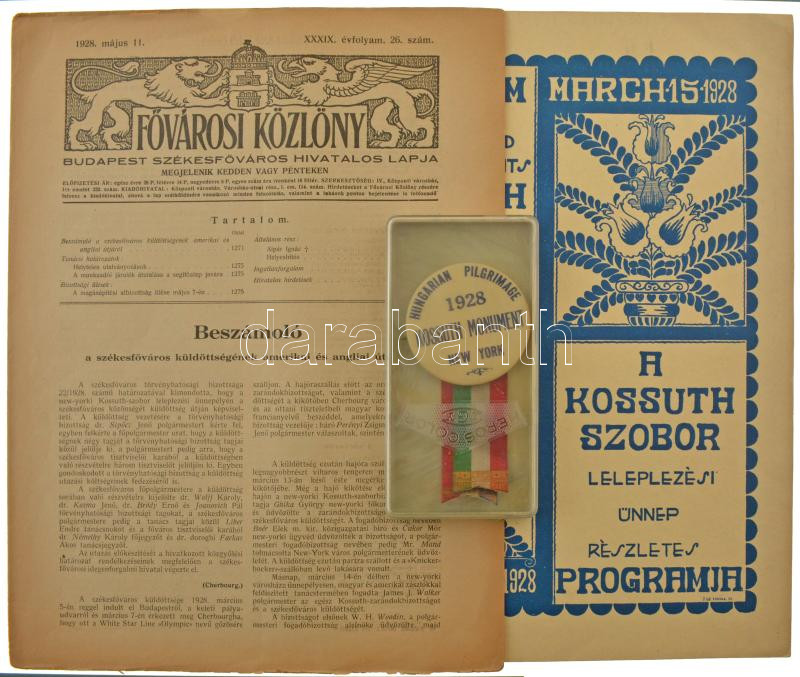 Amerikai Egyesült Államok 1928. "Hungarian Pilgrimage - Kossuth Monument 1928 New York (Magyar Zarándoklat - Kossuth-emlékmű)" műanyag kitűző magyar és amerikai trikolor szalagokkal, tokban (56mm) + "A Kossuth-szobor - Leleplezési ünnep részletes programja + Fővárosi Közlöny - Budapest Székesfőváros Hivatalos Lapja, 1928. május 11. XXXIX. évfolyam 26. szám, benne cikk az eseményről T:AU USA 1928. "Hungarian Pilgrimage - Kossuth Monument 1928 New York" plastic badge with hungarian and american tricolor ribbon, in case (56mm) + "Program of the Festivities and Entertainments - Kossuth Monument Unveiling" + Fővárosi Közlöny - Budapest Székesfőváros Hivatalos Lapja, 11th May 1928, 39th Year, 26. In it article about the event C:AU