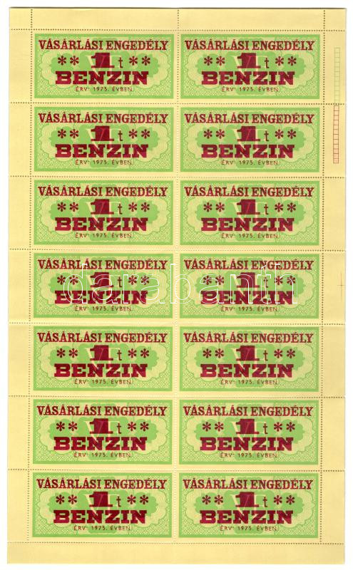 Beschreibung: 1975. "Vásárlási engedély - 1T Benzin" (14x) bélyeg, teljes ív T:III