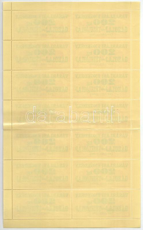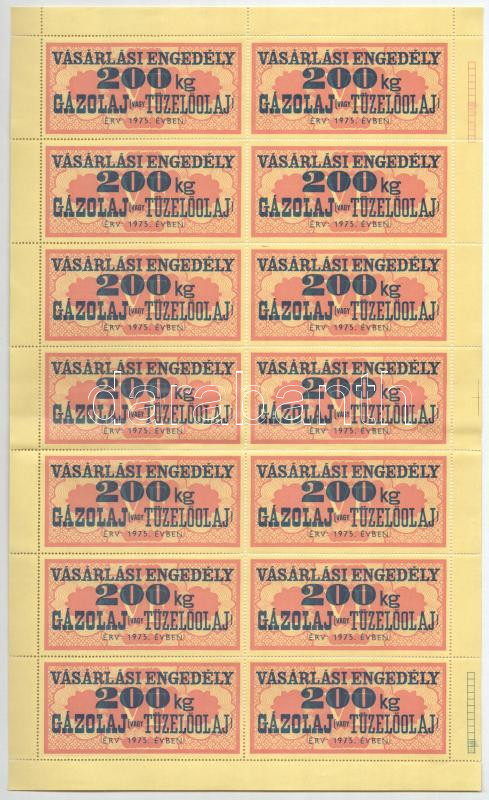 Beschreibung: 1975. "Vásárlási engedély - 200kg Gázolaj vagy Tüzelőolaj" (14x) bélyeg, teljes ív T:III perforációnál szakadás