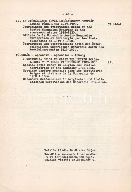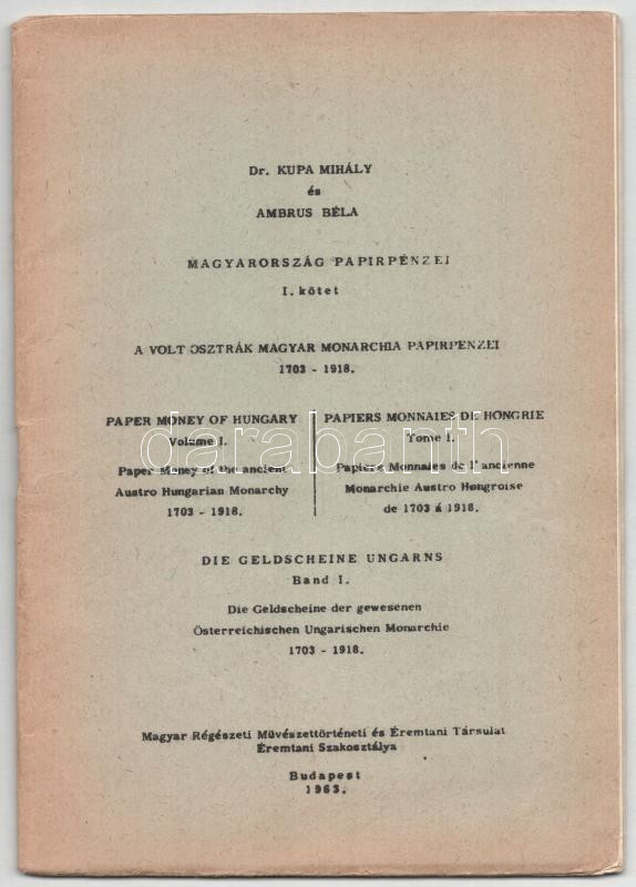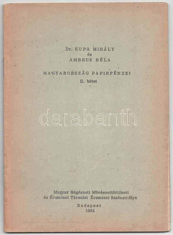 Dr. Kupa Mihály - Ambrus Béla: Magyarország papírpénzei I., II. kötet. Budapest, Magyar Régészeti Művészettörténeti és Éremtani Társulat Éremtani Szakosztálya, 1963., 1964. használt állapotban