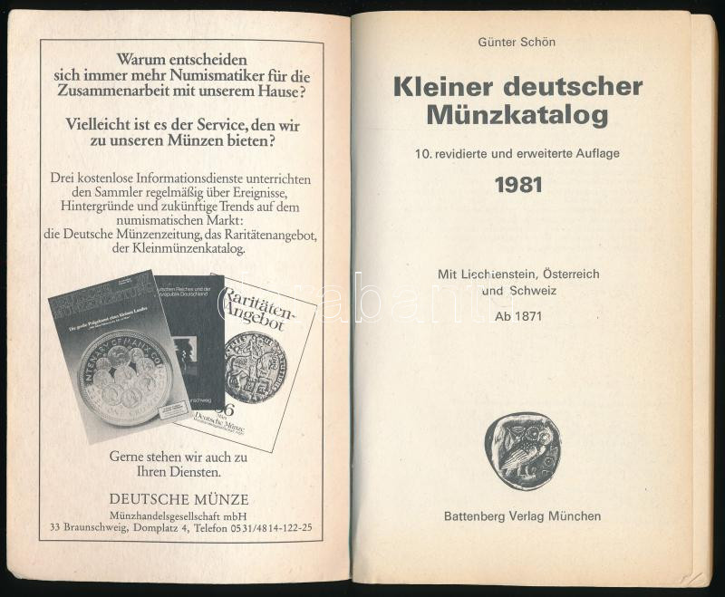 Günter Schön: Kleiner deutscher Münzkatalog - mit Liechtenstein, Österreich und Schweiz Ab 1871. (Kis német érmekatalógus - Liechtensteinnel, Ausztriával és Svájccal 1871-től) - 10. Kiadás. Battenberg, München, 1981. Használt állapotban, tollas vonásokkal.