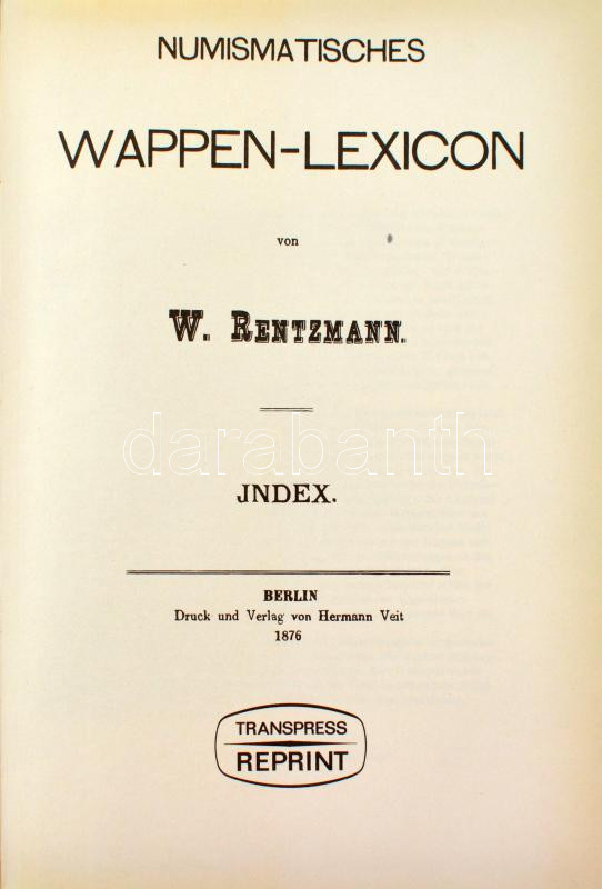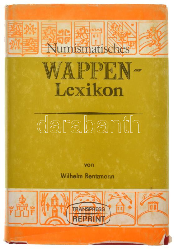 Wilhelm Rentzmann: Numismatisches Wappen-Lexikon (Numizmatikai címerlexikon). Transpress Reprint, Berlin, 1980. Használt, jó állapotban, a külső papírborító kopott, szakadt.